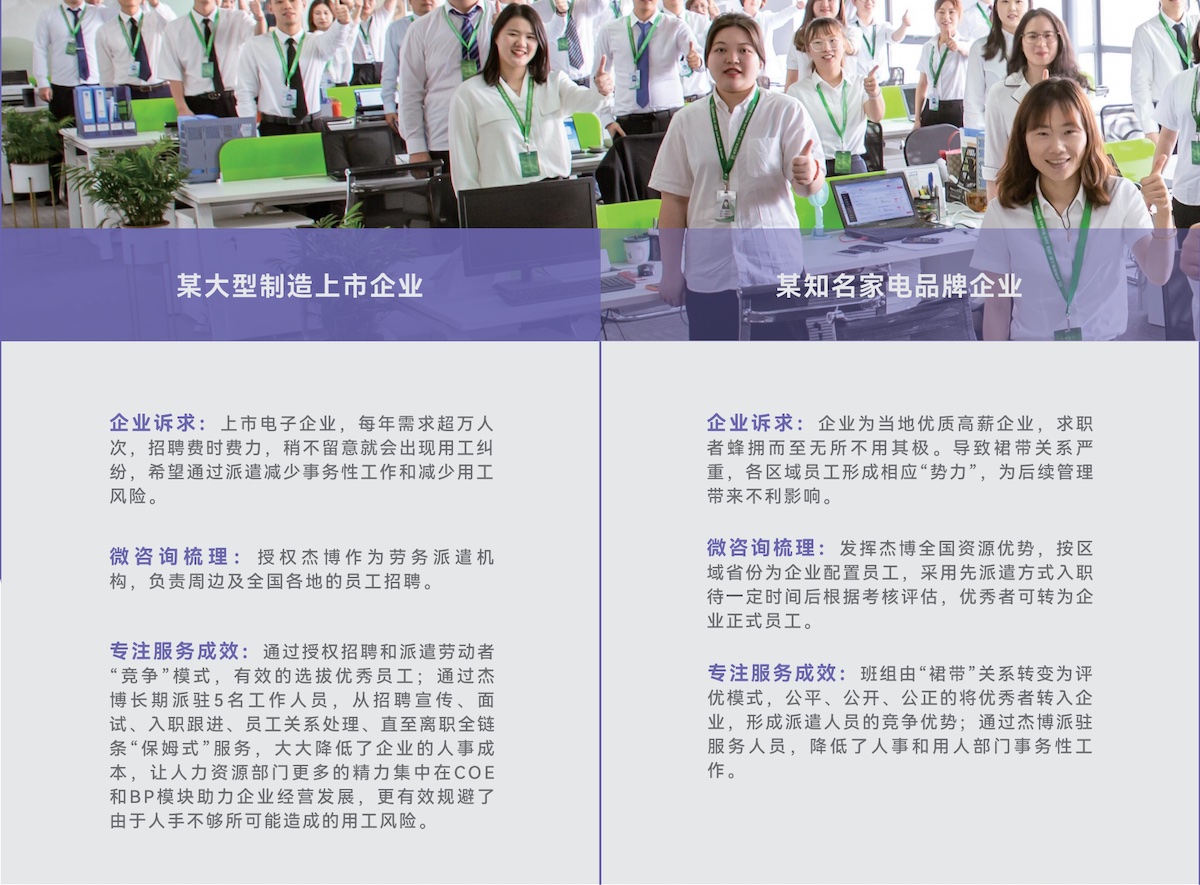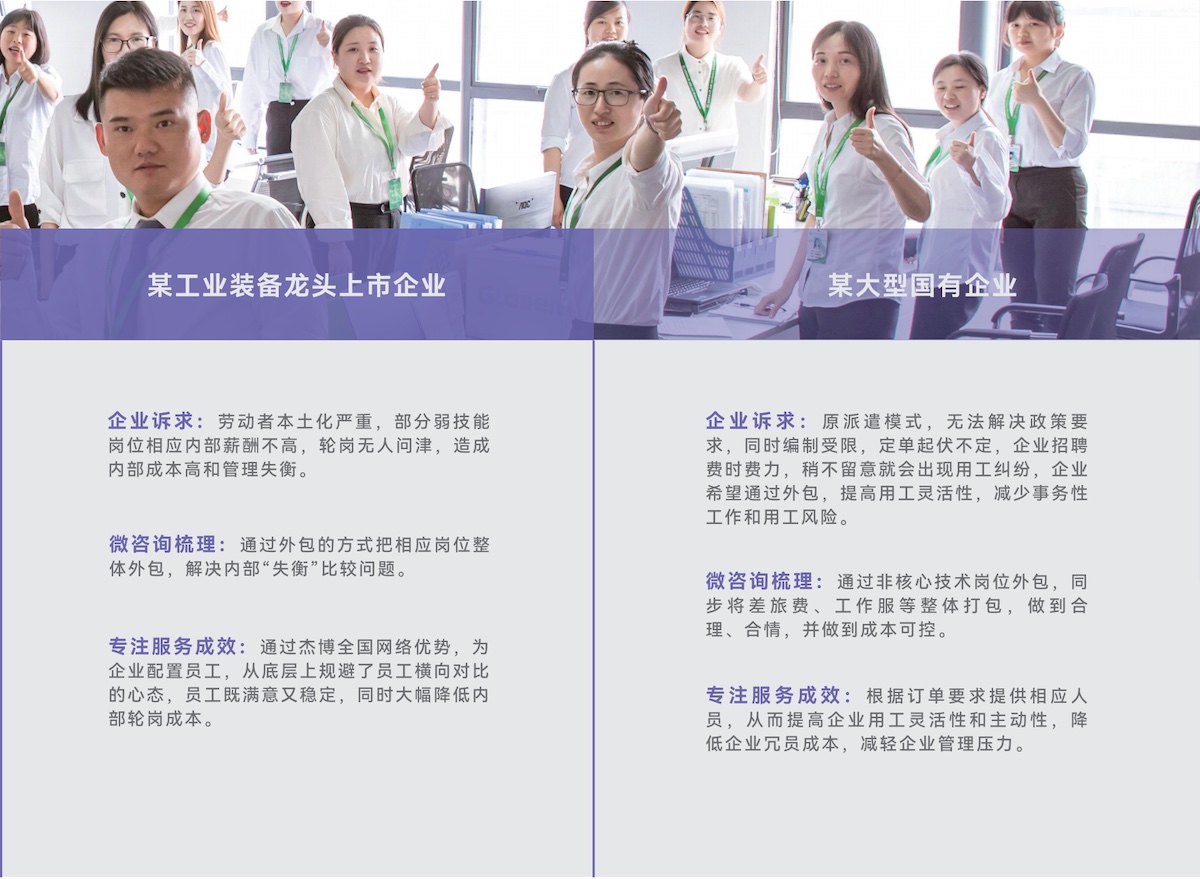 某24小時(shí)智能無(wú)人便利連鎖企業(yè)企業(yè)述求:新興無(wú)人零售模式,需要在全國(guó)范圍內(nèi)迅速鋪開零售點(diǎn)位,大批量且時(shí)間緊迫的招、用、退工給企業(yè)內(nèi)部HR部門帶來(lái)巨大工作壓力,希望通過(guò)采購(gòu)專業(yè)的第三方服務(wù)提高工作效率,優(yōu)化用工成本。 微咨詢梳理:全國(guó)各地短時(shí)出現(xiàn)招、用、退工的高峰,涉及六十多個(gè)城市,三千多名員工;但企業(yè)當(dāng)?shù)厝肆Y源部門的缺失或是來(lái)不及配置相應(yīng)工作人員,導(dǎo)致社保等福利漏錯(cuò),勞動(dòng)合同、漏簽錯(cuò)簽等用工風(fēng)險(xiǎn)頻發(fā);企業(yè)總部人資部門對(duì)當(dāng)?shù)氐恼吡私獠怀浞?,無(wú)法更高效的指導(dǎo)工作。 專注服務(wù)成效:杰博利用全國(guó)百余個(gè)分支機(jī)構(gòu)的優(yōu)勢(shì),快速響應(yīng)各城市的招、用、退工作安排,用專業(yè)流程化的服務(wù)把錯(cuò)漏降低到“零”;日清月報(bào)制度讓企業(yè)總部實(shí)時(shí)“掌控”各城市用工數(shù)據(jù),為企業(yè)高速發(fā)展做到真正的保駕護(hù)航。 | 某游戲開發(fā)企業(yè)企業(yè)述求:該企業(yè)規(guī)模不到百人,基本是游戲開發(fā)崗位,企業(yè)初創(chuàng)期,需要穩(wěn)定專業(yè)的人事處理員工基本用工事務(wù),比如勞動(dòng)合同簽訂、社保繳納、工資計(jì)算下發(fā);但人事崗位半年換了三人,交接期間多次出現(xiàn)因書面錯(cuò)誤導(dǎo)致的勞動(dòng)仲裁;企業(yè)希望通過(guò)采購(gòu)專業(yè)的第三方服務(wù)降低相應(yīng)風(fēng)險(xiǎn)。 微咨詢梳理:人事崗工作瑣碎,但技術(shù)要求并不高,歷屆人事工作資歷偏淺,但招用老練的人事又超出了用工成本,企業(yè)管理層希望更聚焦的做研發(fā)提升企業(yè)活力。 專注服務(wù)成效:杰博配置專業(yè)的客服人員,用在線系統(tǒng)工具處理各項(xiàng)人事工作,把人力資源工作流程化、可視化!讓企業(yè)用低于市場(chǎng)人事專員的成本獲得更高效的服務(wù)結(jié)果! |