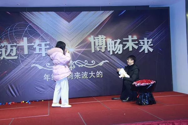 晚上18:28分,年會晚宴隨著主持人的出場拉開序幕,在杰博溫州公司總經(jīng)理、杰博合伙人趙寧先生寄語新年新氣象的精彩祝酒詞中,大家高舉酒杯,歡呼慶祝過去十年的成長與成就,憧憬祝福接下來的十年。隨后,進(jìn)入用餐抽獎環(huán)節(jié),在熱烈的喝彩、掌聲中,各個獎項逐一揭曉,幸運(yùn)兒們激動不已、笑容滿面。晚宴在一場浪漫的求婚中進(jìn)入高潮。他們相識五年、相戀五年,攜手從校園走進(jìn)杰博大家庭,一起努力、共同成長。這一天,在杰博家人的見證下,約定共同開啟美好的明天。