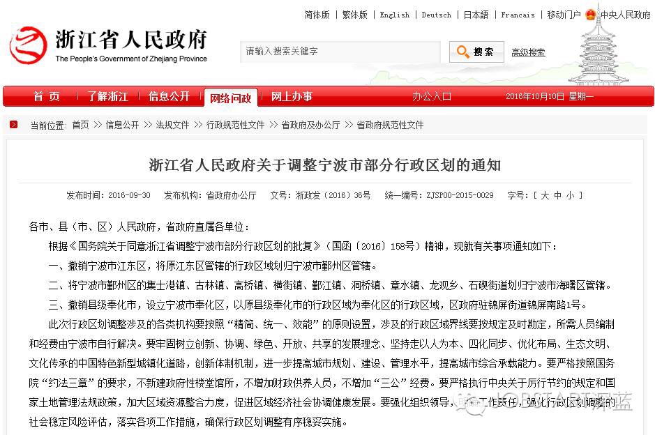 根據(jù)《國(guó)務(wù)院關(guān)于同意浙江省調(diào)整寧波市部分行政區(qū)劃的批復(fù)》(國(guó)函〔2016〕158號(hào))精神,現(xiàn)就有關(guān)事項(xiàng)通知如下:
